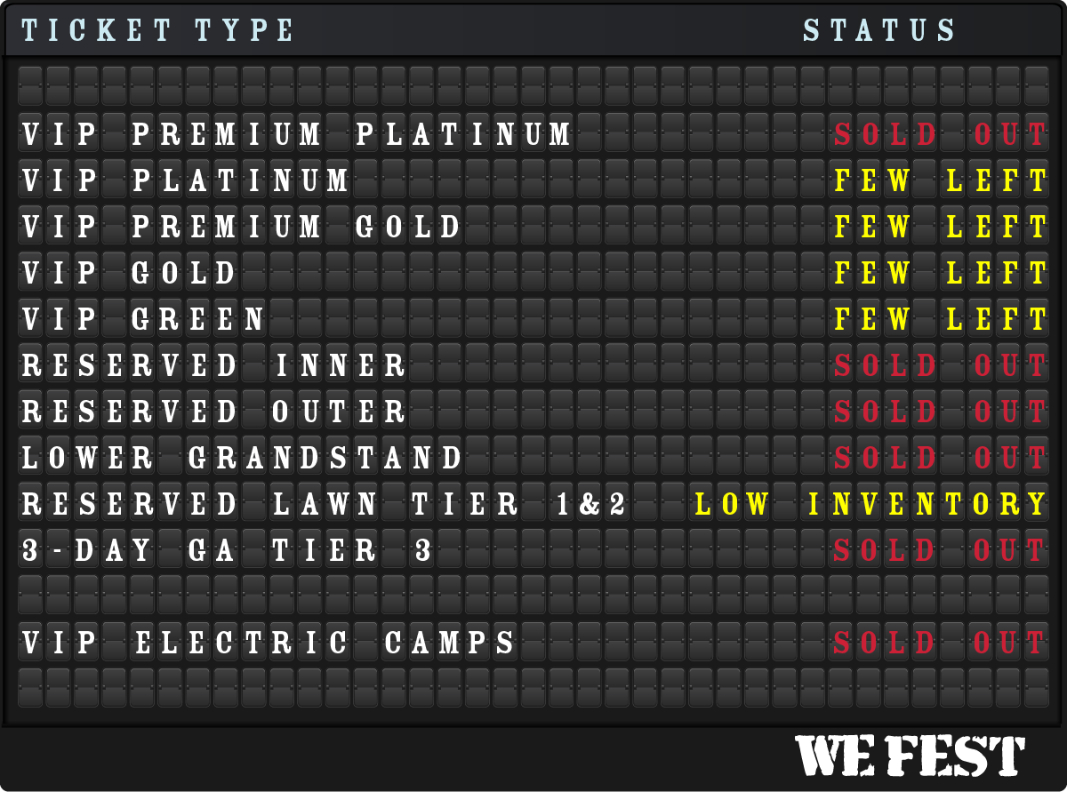 The only way to ensure that your WE Fest tickets are valid is to purchase them directly from WE Fest. Each year, fraudulent tickets are sold on social media and by third-party sellers. Tickets bought outside official channels are not guaranteed to be real, and entry may be denied.
